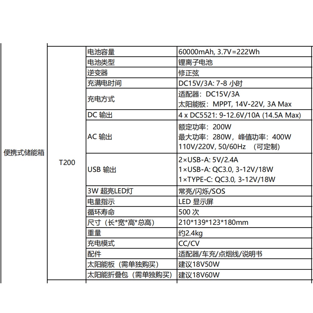 電池容量 60000mAh, 3.7V=222Wh 電池類型(xíng) 鋰離子電池 逆(nì)變器 修正弦 充滿電時間 DC15V/3A: 7-8 小時 充電方式 適配器:DC15V/3A 額定功率:200W 最大功率:280W,峰(fēng)值功率:400W 電量指示 LED 顯示屏 循環壽命 500 次 尺寸(長*寬*高(gāo)*總高) 210*139*123*180mm